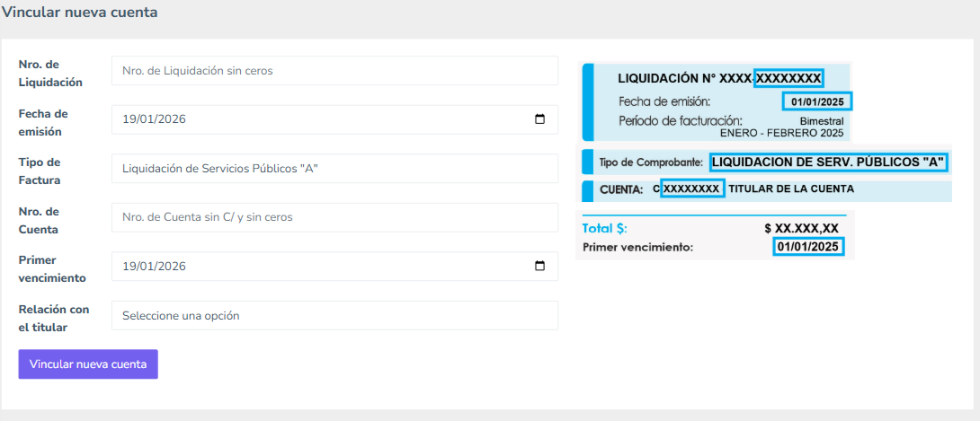 5.- Vinculá tu cuenta ingresando los datos de tu factura. Una vez vinculada, podrás descargar tus facturas.